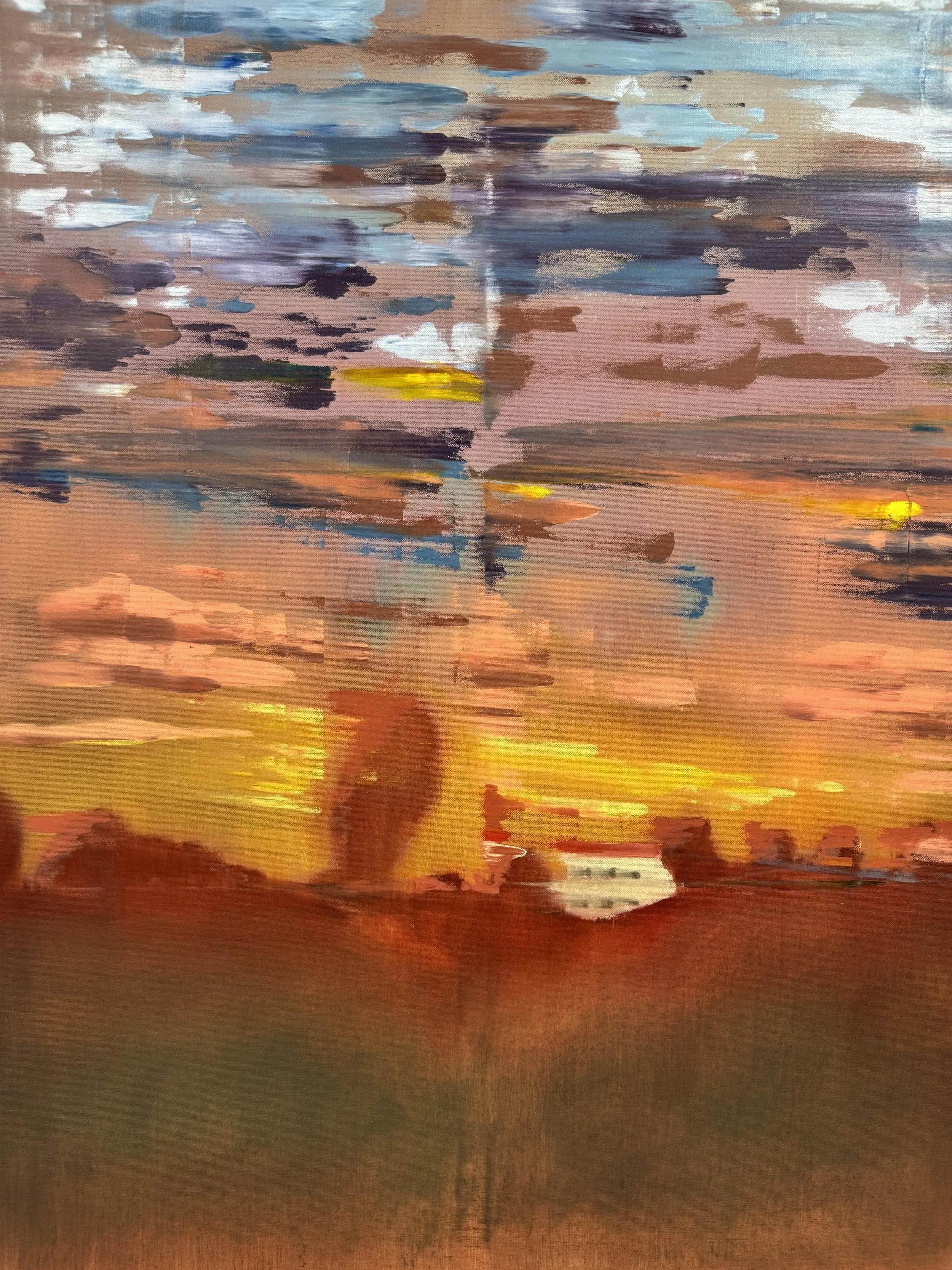Abstract painting of a sunset with vibrant colors including orange, yellow, pink, and blue in the sky, and dark silhouettes of trees and buildings in the foreground.