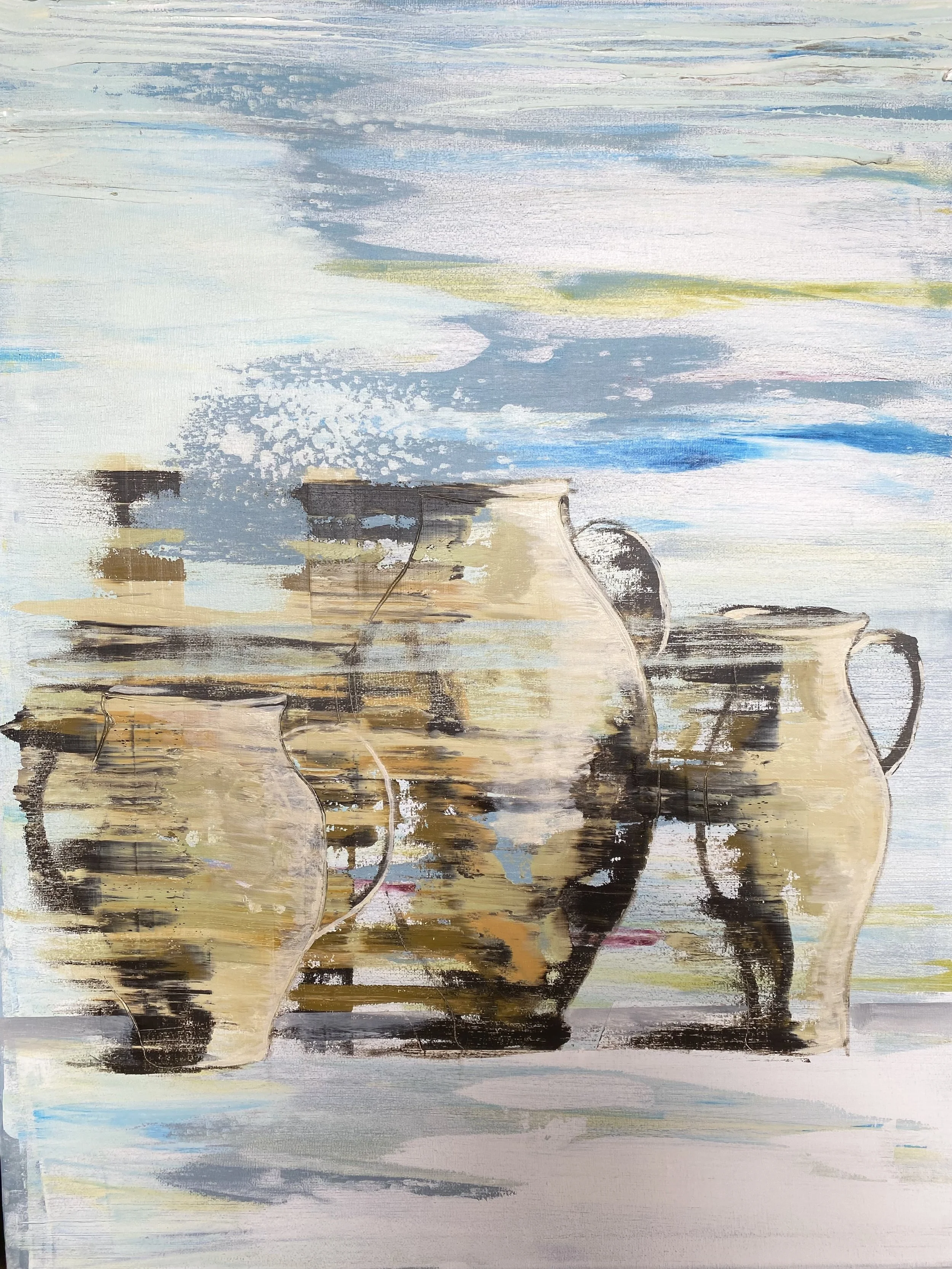 Abstract painting of vases with a sky and clouds background.
