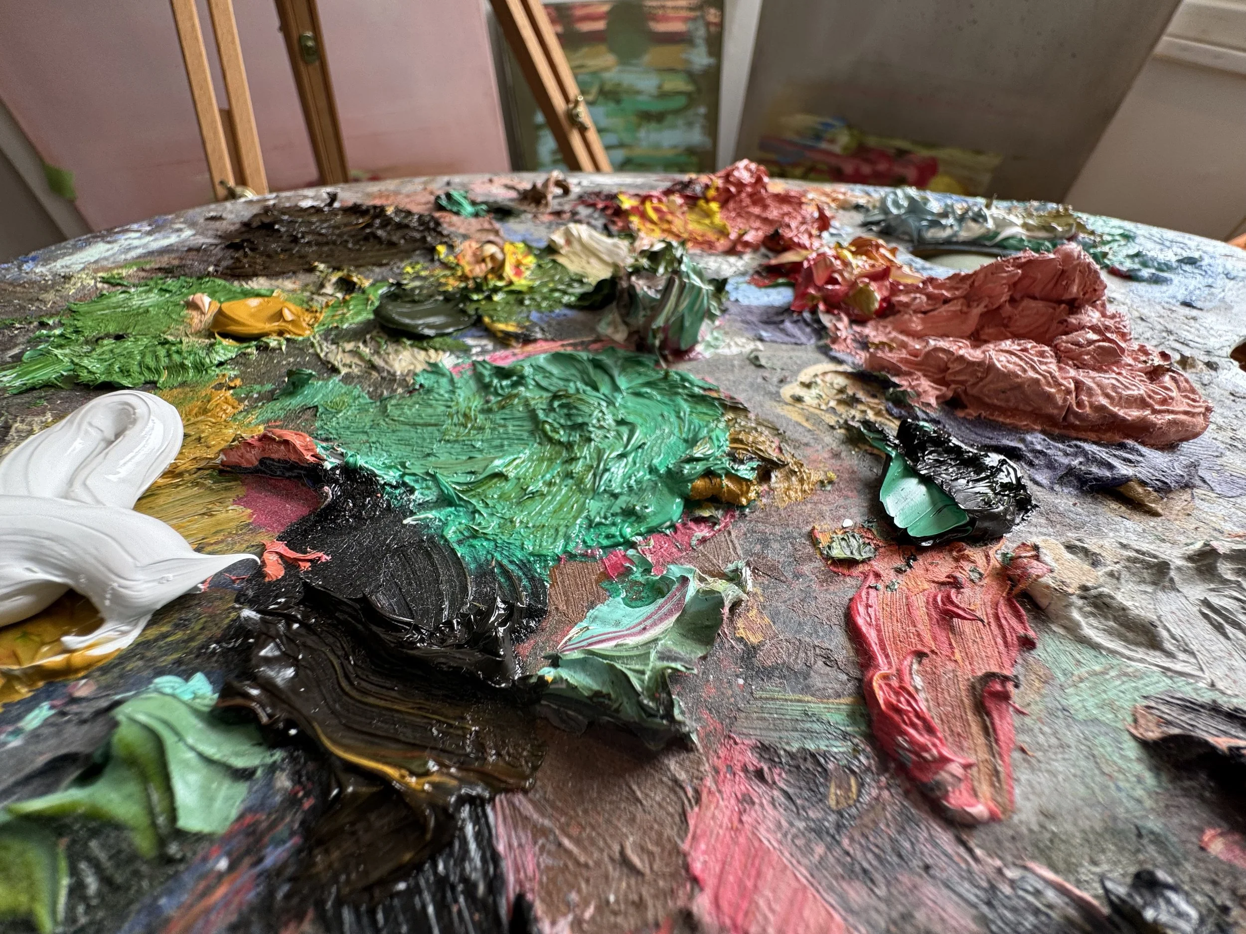 Close-up of a painter's palette with various colors of thick, textured oil paint, including green, black, white, pink, and blue.